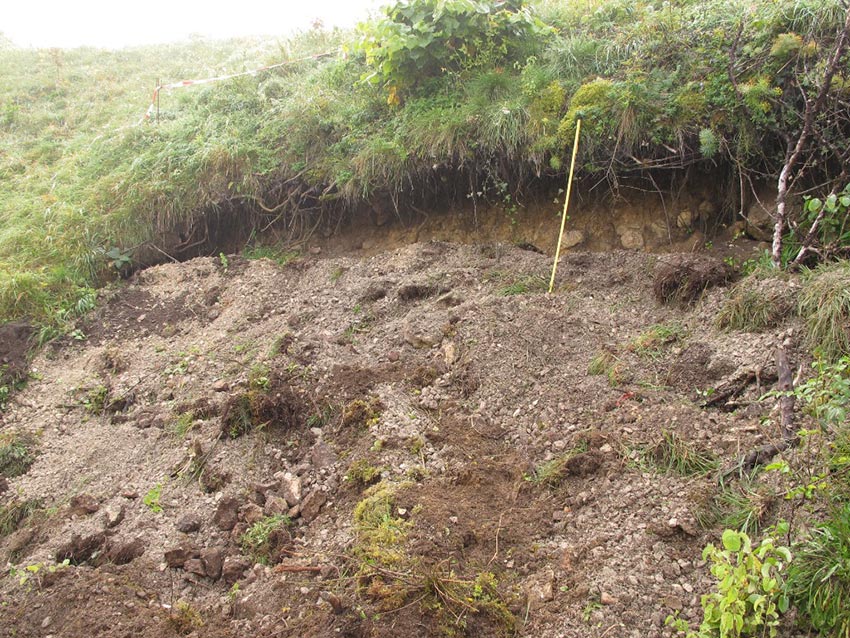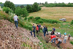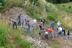 In einer ersten Aktion im Herbst letzten Jahres war mit Unterstützung der Marktgemeinde das Loch grob verfüllt worden. Die Gemeinde ließ mit einem Kleinbagger Schotter in das Loch einbringen. Jetzt schleppten die fleißigen Helfer Steine und Erde zum Loch hoch und glichen den Wall wieder seiner ursprünglichen Form an. Durch die Maßnahme wird auch verhindert, dass der Wall weiter erodiert.