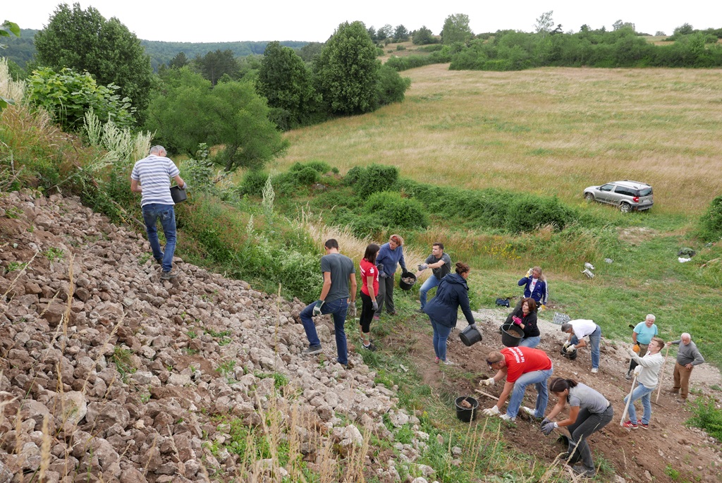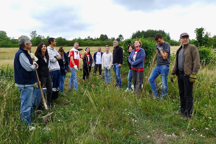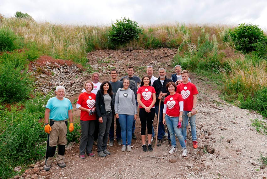 15 Helfer haben mit Pickeln, Schaufeln und Eimern gearbeitet , Steine und Erde geschleppt, um ein Grabungsloch am Inneren Wall auf dem Burgberg in Kallmünz aufzufüllen. Mit dabei waren fünf Mitarbeiter der Sparkasse Regensburg Königswiesen Süd, die im Rahmen der Helfertrage das Projekt unterstützt hat. Dr. Steinmann von Landesamt für Denkmalpflege war vor Ort und hat die Arbeiten angeleitet und auch selbst mit Hand angelegt.