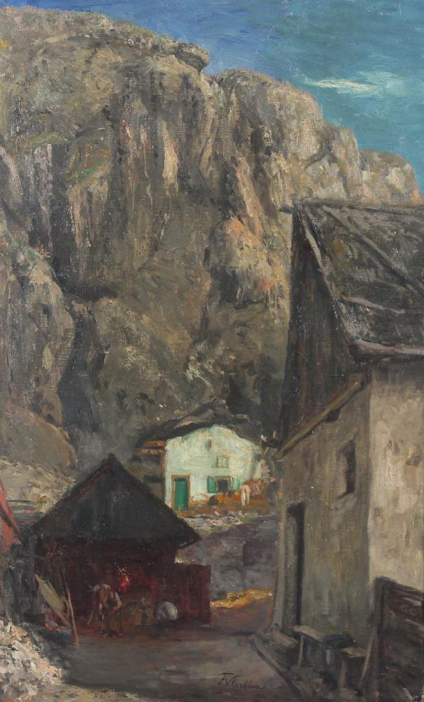 Ein weiteres Bild von Skarbina aus Kallmünz ist bei einer Kunstauktion in Münster aufgetaucht. Es zeigt eine Ansicht in der Vilsgasse, die damals noch existierende Schmiede und dem "Haus ohne Dach" unter den massiven Felsen des Schlossbergs.