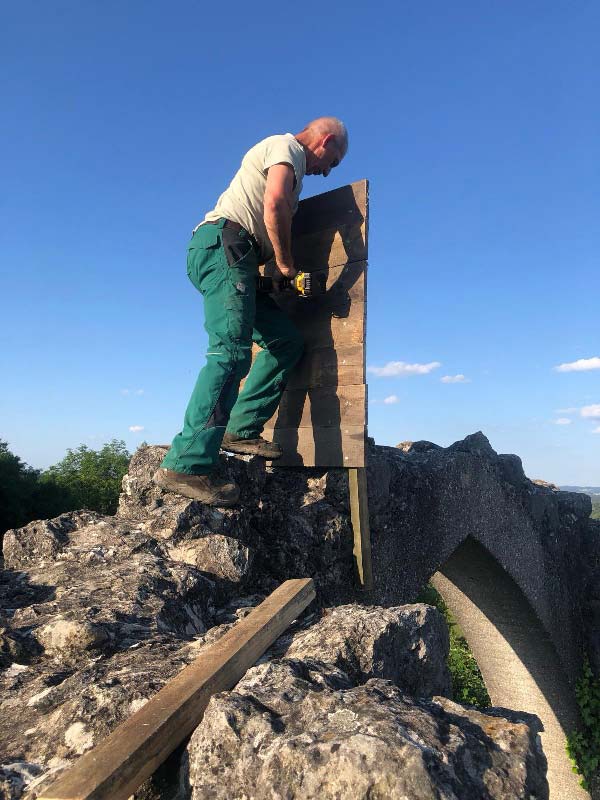 Hans Graml bei Sicherungsmaßnahmen, damit die Ziegen nicht über die Mauern springen!