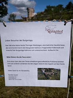 Die Beweidung vom Keltenwall bis zum Burginnenhof erfolgt in mehreren Abschnitten, so dass die Besucher nicht beeinträchtigt werden. Ein elektrischer Zaun und Absperrungen gewährleisten, dass die Ziegen nur den gewünschten Bereich abfressen.